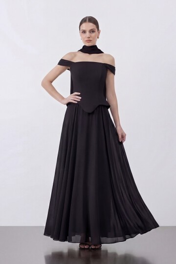 Şal Detaylı Kare Yaka Zarif Uzun Abiye - 2138