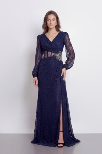 Dantel Drapeli V Yaka Yırtmaçlı Abiye - 2151