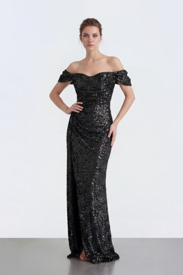 Işıltılı Payet Omzu Açık Drapeli Yırtmaçlı Abiye - 2134