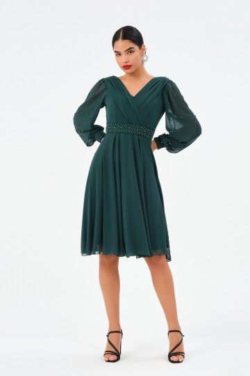 İnci İşlemeli Drapeli Midi Elbise - 1512