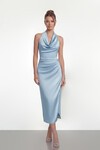 Saten Halter Yaka Drapeli Midi Abiye - 2084