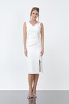 İncili Drapeli Kayık Yaka Midi Elbise - 1446